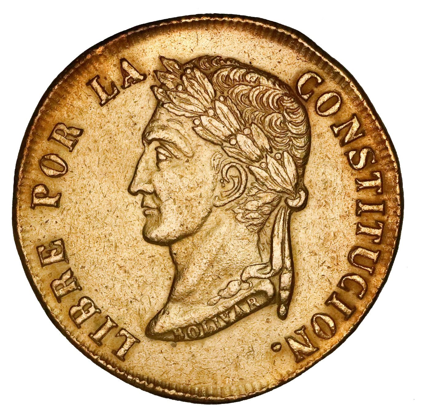 Potosi, Bolivia, gold 8 scudos, 1852FP, left-facing bust, rare. KM-115. Highly sought one-year type with larger, left-facing bust in higher relief, boldly struck AU with matte (lightly marked) surfaces, spot of discoloration on reverse rim.
