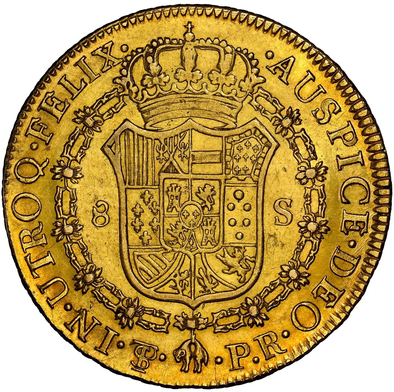 Potosi, Bolivia, gold bust 8 escudos, Charles III, 1778 PR, very rare, NGC AU 58, finest known in NGC census. Janson-68.1; KM-59; Cal-2061. Very highly desirable first date of type, struck in only 1,030 pieces, representing the very first gold coins struck at this prolific mint after two centuries of silver-only production, notably missing in major collections like Eliasberg and Garrett (and so many others), this example with good luster and only a few small marks away from Mint State, hands down the finest of only three that have made it to market in at least the past decade, including an AU 53 we offered in October 2013 (Sedwick Auction 14).