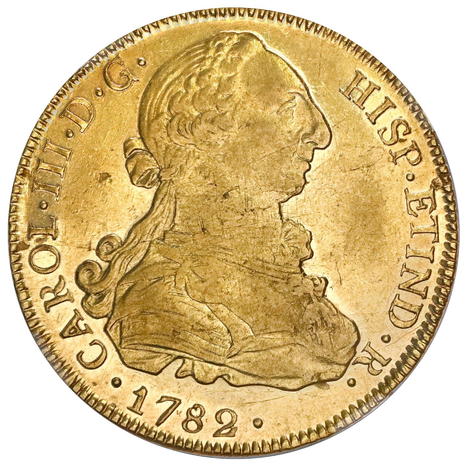 Potosi, Bolivia, gold bust 8 escudos, Charles III, 1782PR, NGC AU 50. Janson-68.5; KM-59; Cal-2066. Good luster, light wear on bust and faint surface hairlines in obverse fields, tiny lamination in front of nose, desirable type (much scarcer than Mexico or Lima). NGC #5934196-005.
