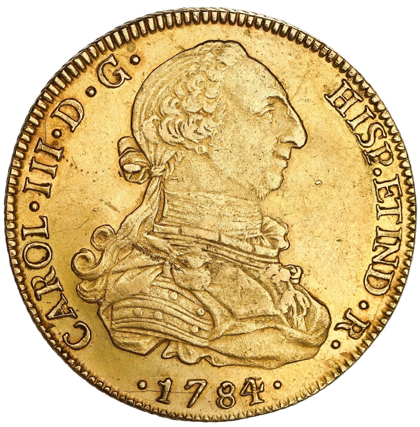 Potosi, Bolivia, gold bust 8 escudos, Charles III, 1784/3 PR. Janson-68.7.1; Cal-2068; KM-59; Fr-1. 27.01 grams. Lightly cleaned AU with nice luster, choice details from an exemplary strike, scarce overdate.