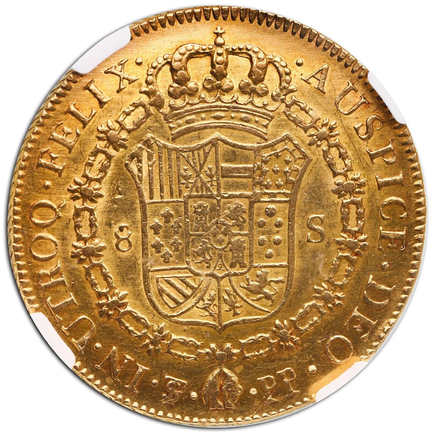 Potosi, Bolivia, gold bust 8 escudos, Charles IV, 1800 PP, NGC AU 58 ("top pop").
