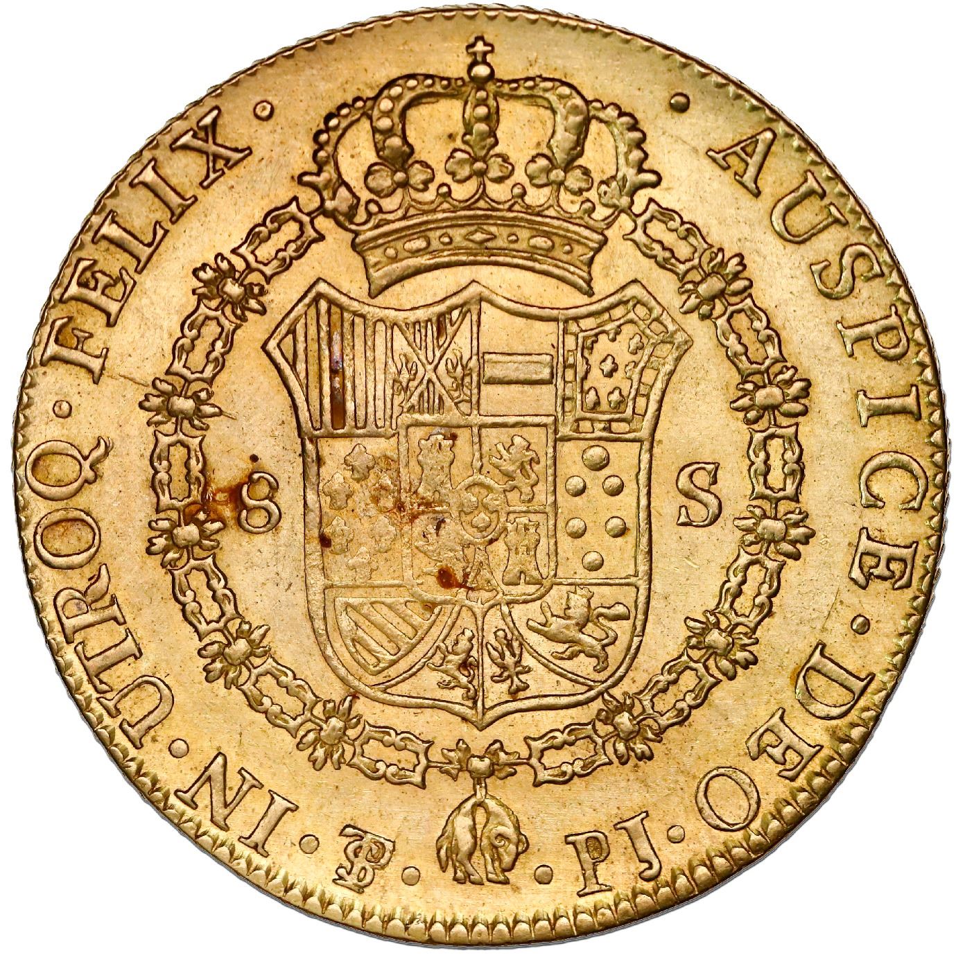 Potosi, Bolivia, gold bust 8 escudos, Charles IV, 1808PJ. Janson-72.20; KM-81; Cal-1714. 27.00 grams. Lustrous UNC with light hairlines on satin surfaces, a few tiny orange spots on reverse. According to Janson, 1808-dated coins of Charles IV were struck as late as 1810.