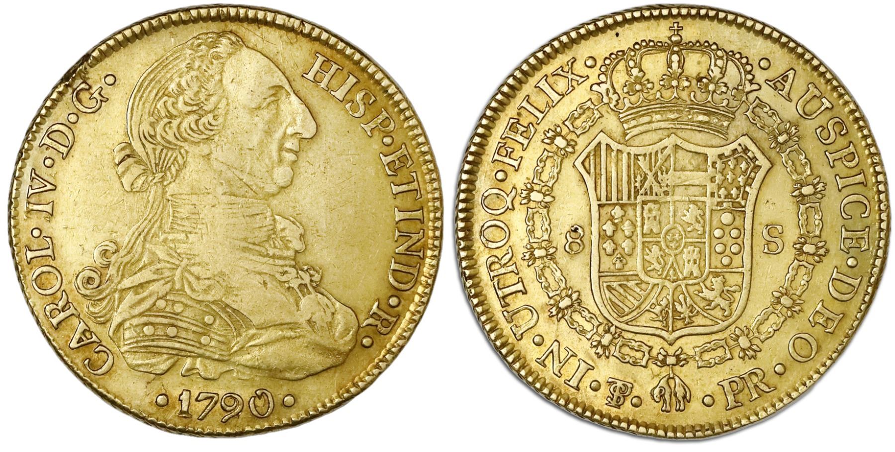Potosi, Bolivia, gold bust 8 escudos, Charles IV transitional (bust of Charles III, ordinal IV/III), 1790/89PR. Janson-72.2.1; KM-68; Cal-1692. 26.92 grams. Problem-free XF with traces of light red toning and luster in legends, small natural lacuna in part of obverse rim.