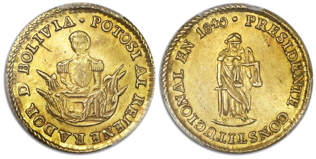 Potosi, Bolivia, gold medallic 1 scudo, 1840, Velasco, rare, PCGS AU details / scratch, ex-Whittier (stated on label). Burnett-18.1 var; Fonrobert-9526. Obverse with military bust above flags on poles within legend POTOSI EL REJENERADOR D BOLIVIA; reverse with standing Justice within legend PRESIDENTE CONSTITUCIONAL EN 1840. Curiously, Burnett remarks that Fonrobert simply missed the E in monogrammed DE, but the present specimen shows clearly that at least some examples have no E component at all. Light toning over muted luster, bold strike, small scratch under I of BOLIVIA. PCGS #32917089. Pedigreed to the Whittier collection.