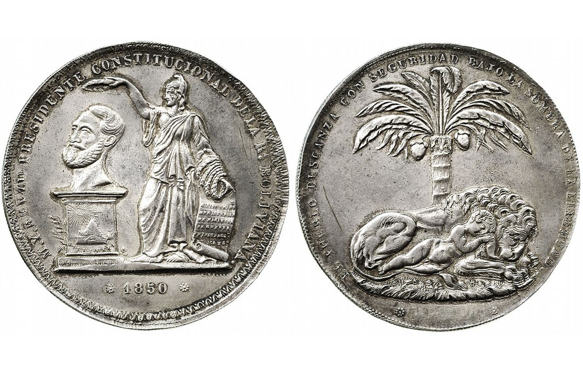 Potosi, Bolivia, huge silver medal, 1850, Belzu. B-30A. 70mm; 114.7 grams. Obverse with lion and child together beneath palm tree, legend of EL PUEBLO DESCANZA CON SEGURIDAD BAJO LA SOMBRA DE LA LIBERTAD; reverse with Liberty placing wreath on bust of Belzu with legend M.Y. BELZU PRESIDENTE CONSTITUCIONAL DE LA RA. BOLIVIANA, date in exergue (lacking PREMIO as seen on others). Very bold XF, lightly toned with muted luster, the rims slightly crude and all the details very slightly doubled. Pedigreed to the Alberto "Coco" Derman collection (Cayon, December, 2007, lot 783, with lot-tag).