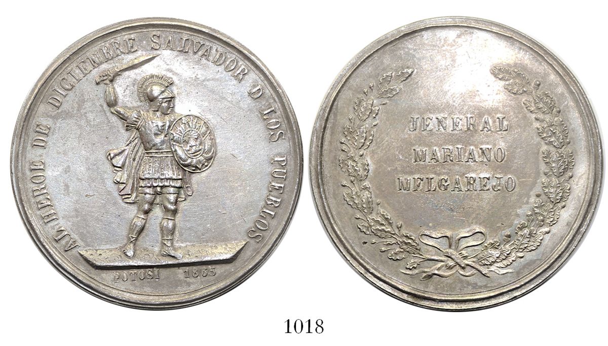 Potosi, Bolivia, large and heavy silver medal, 1865, General Melgarejo, ex-Derman. Fonr-9671. 74.74 grams. Choice XF+ with luster and light rainbow toning, minor marks but overall quite nice, desirable pedigree. Pedigreed to the Alberto "Coco" Derman collection