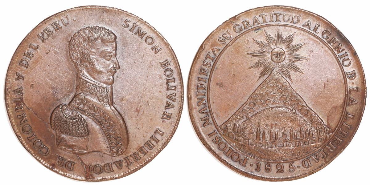 Potosi, Bolivia, large copper medal, 1825, Bolivar, rare metal for issue. 29.53 grams; 42.5mm. Obverse with bust of Bolivar inside legend SIMON BOLIVAR LIBERTADOR DE COLOMBIA Y DEL PERU; reverse with sun-topped mountain of Potosi inside legend POTOSI MANIFESTA SU GRATITUD AL GENIO DE LA LIBERTAD with date 1825 at bottom. Light brown AU- with muted luster, toning around details, flan-crack to bottom-left of bust.