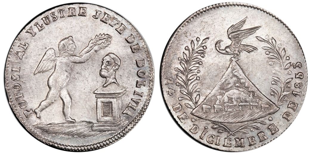 Potosi, Bolivia, medallic 1 sol, 1853, Belzu / Christmas Eve, coin axis, PCGS MS63, ex-Whittier (stated on label). Burnett-61B; Fonrobert-9582 var. Obverse with standing angel placing wreath on bust off Belzu on pedestal inside legend POTOSI AL YLUSTRE JEFE DE BOLIVIA; reverse with condor atop Cerro de Potosi inside wreath and legend 24 DE DICIEMBRE DE 1853. Muted luster with faint toning, minimal high-point wear. PCGS #32913686. Pedigreed to the Whittier collection.