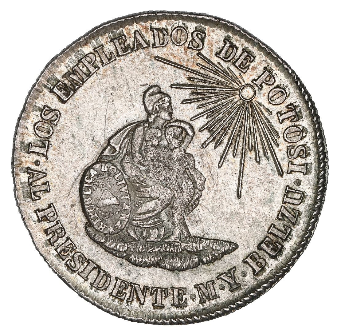 Potosi, Bolivia, medallic 2 soles, 1852/1, Belzu / criminal, coin axis, reeded edge, NGC UNC details / scratches. Burnett-43 var (reeded edge); Fonrobert-9567 var (overdate). 6.55 grams. Obverse with seated Liberty with youth and baby looking toward radiant sun at right within legend LOS EMPLEADOS DE POTOSI at top and AL PRESIDENTE . M. Y. BELZU at bottom; reverse with fleeing criminal being chased off a cliff to right by a sword coming from clouds to left within legend LA PROVIDENCIA PERSIGUE EL CRIMEN with date 1852/1 at bottom; reeded edge (overdate and edge not mentioned on label). The inspiration for the fleeing criminal theme is the attempted assassination of Belzu on September 6, 1850. Bold strike with weak centers, lightly toned over luster, innocuous scratches on both sides. NGC #5969161-002.