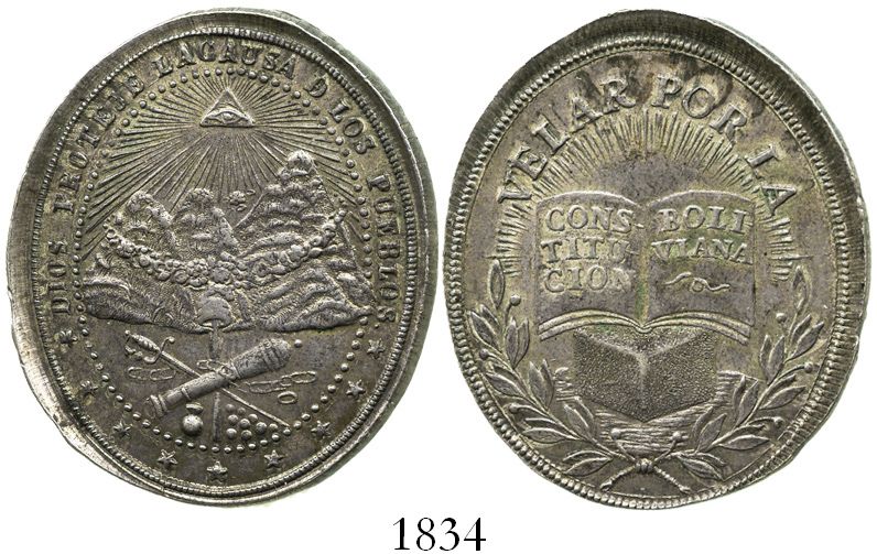 Potosi, Bolivia, oval silver medal, 1800s, pueblos, ex-Derman. Fonrobert-9453 (similar). 19.8 grams. Obverse with Constitution book and legend VELAR POR LA that continues on the pages with CONSTITUCION BOLIVIANA; reverse with mountains under radiant eye and above military spoils within legend DIOS PROTEJE LA CAUSA (DE) LOS PUEBLOS; nicely toned and lustrous AU. Pedigreed to the Alberto "Coco" Derman collection (Cayon auction of December 2007, with original lot-tag #707).
