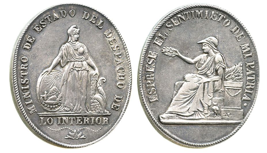 Potosi, Bolivia, oval silver medal, Office of the Interior (1800s). Fonrobert-9431. 43×35.5mm; 31.1 grams. Obverse with Liberty standing with arms and cornucopia with legend MINISTRO DE ESTADO DEL DESPACHO DE / LO INTERIOR; reverse with seated Liberty holding laurel wreath, legend of ESPRESE EL SENTIMIETO DE MI PATRIA. Lustrous XF with very light toning, attractively bold. Pedigreed to the Alberto "Coco" Derman collection (Cayon, December, 2007, lot 704, with lot-tag).