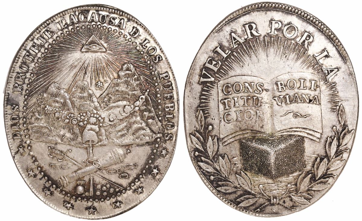 Potosi, Bolivia, oval silver medal, post-1825, Constitution, rare, ex-Derman collection. 18.94 grams, 36x29mm. Obverse with open book below VELAR POR LA and CONSTITUCION BOLIVIANA on pages above laurel wreath; reverse with collage of national symbols and legend DIOS PROTEJE LA CAUSA D[E] LOS PUEBLOS and stars; lustrous and attractive AU with incomplete rims (as made). Pedigreed to the Alberto "Coco" Derman collection.