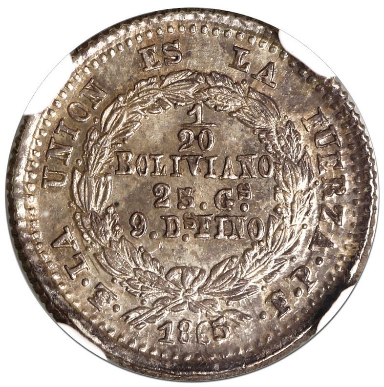 Potosi, Bolivia, piefort pattern 1/20 boliviano, 1865/4 FP, very rare, NGC MS 65.