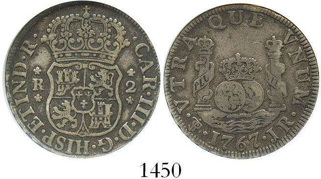 Potosi, Bolivia, pillar 2 reales, Charles III, 1767JR, encapsulated ANACS VF 20. KM-48; CT-1376. Richly old-toned and problem-free, more like VF-35 by today's standards.