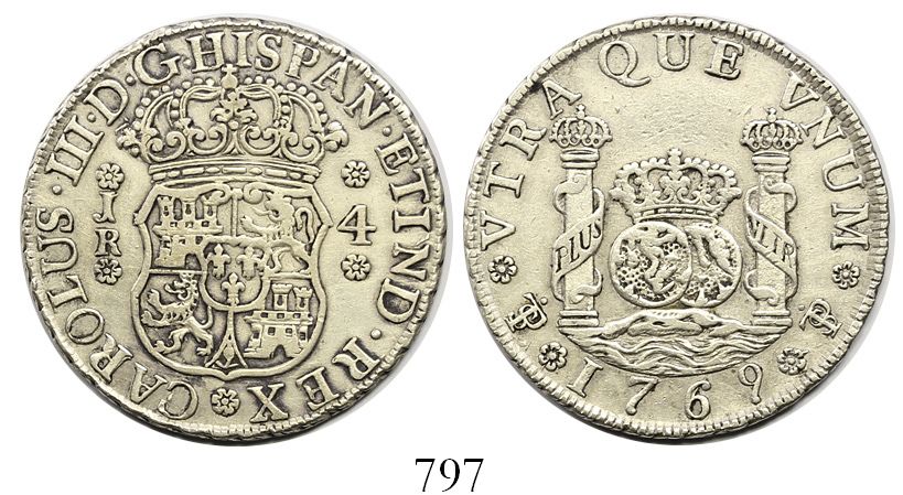 Potosi, Bolivia, pillar 4 reales, Charles III, 1769JR, fancy 9, round-top 6 over straight 6 in date (very rare). KM-unl (49 for type).; CT-1170. 13.38 grams. XF with muted luster, toned around details, well struck with very clear rectification of the 6 in the date with a new punch.