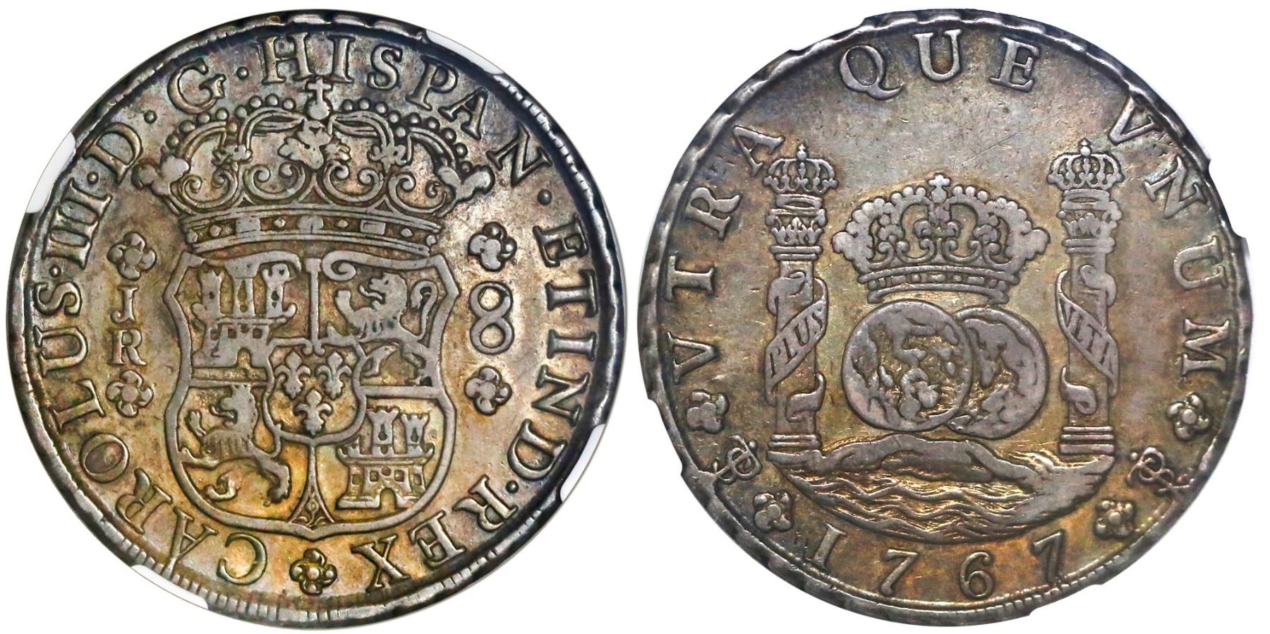 Potosi, Bolivia, pillar 8 reales, Charles III, 1767JR, four-petal rosette below shield, with dot after king's name, NGC XF 40, ex-Norweb, ex-Brand (both stated on label). Janson-58.1.2; KM-50. Dark golden toning with underlying luster, with light, even wear on high points, rare and popular first date of issue. Pedigreed to the Norweb and the Virgil Brand collections. NGC #3711009-005.