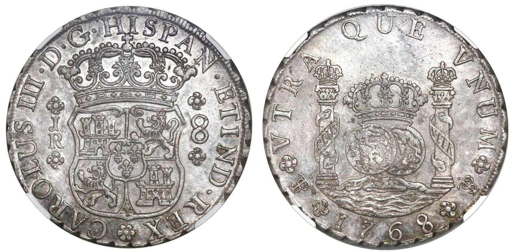 Potosi, Bolivia, pillar 8 reales, Charles III, 1768JR, four-petal rosette below shield, no dot after king's name, NGC AU 55. Janson-unl; KM-unl (50 for Type); CT-unl (cf. 967). 26.86 grams Lustrous and choice (also lightly toned), with minimal marks in fields and slight wear on only the highest points, apparently an unlisted variety without dot after king's name a distinction only made in the Janson reference and omitted in KM and the NGC census where this coin is second finest. NGC #4704300-002.