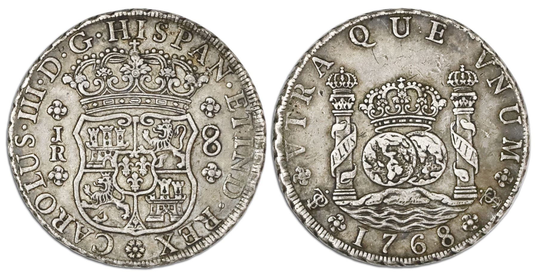Potosi, Bolivia, pillar 8 reales, Charles III, 1768JR, hooked 6, dot after king's name, six-petal rosette at bottom. Yonaka-P8-68b1; Janson-58.2.2; KM-50; Cal-1160. 26.88 grams. Richly toned XF, no major marks, clear example of the variety (one of nine for this date, according to Yonaka).