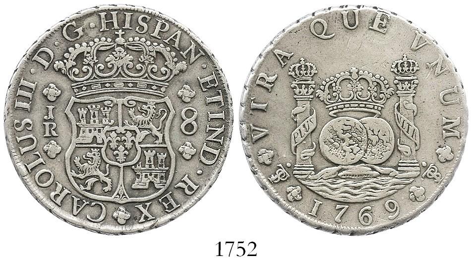 Potosi, Bolivia, pillar 8 reales, Charles III, 1769JR (curved 9).
