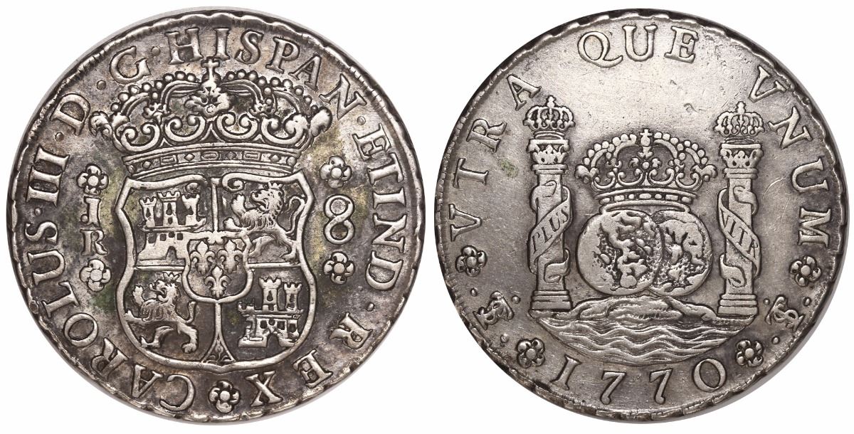 Potosi, Bolivia, pillar 8 reales, Charles III, 1770JR, • after king's name. 27.06 grams. XF with some blue-green toning around details, very slightly off-center pillars side. Pedigreed to our Auction #15 (lot #1179).