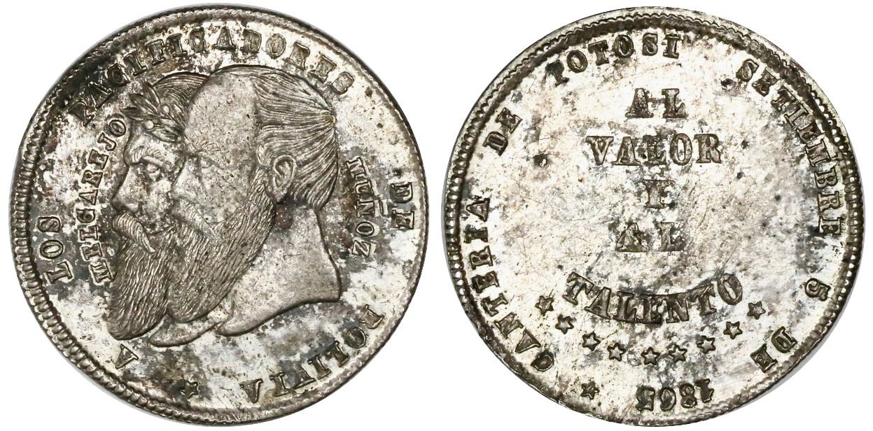 Potosi, Bolivia, silver 1/4 melgarejo (medallic coinage), 1865, Melgarejo & Munoz, NGC MS 61, ex-Cotoca Collection. Fonrobert-9686. 5.05 grams. Very lustrous with streaky dark toning. Pedigreed to the Cotoca Collection. NGC #4686242-015.