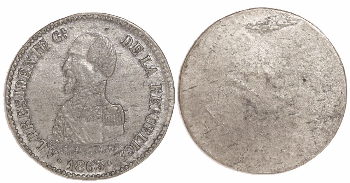 Potosi, Bolivia, uniface trial silver medal, 1863, President de Acha. 3.49 grams, 25mm. Bust of de Acha facing left inside legend AL PRESIDENTE GL. DE LA REPUBLICA 1863. XF with only the barest traces of luster. Note the regular, two-sided issue is 5 grams.