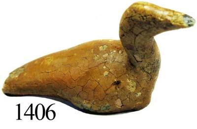 Pre-Columbian "Tonalaware" clay figurine (bird). 3.5 grams, 1½" x 1-1/8". Recognizable as the shape of a water bird with long and streamlined tail and neck and beak, legs broken off (otherwise intact), dark orange color, rare and desirable artifact that was probably intended as a child's toy and made in the village of Tonala near Guadalajara, Mexico (see Galleon Alley by Weller, pp. 118 and 146-9). From the Capitana El Rubí and pedigreed to Art McKee's Sunken Treasure Museum, with certificate.