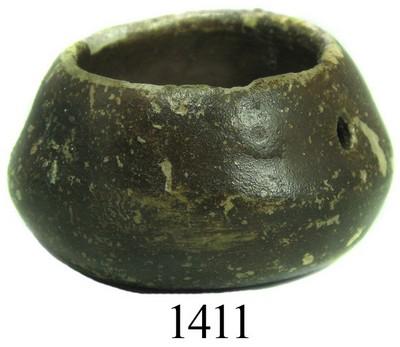 Pre-Columbian "Tonalaware" clay pot. 8.4 grams, 1¼" in diameter and ¾" tall. A mini-cauldron without handle or base, sloped sides and wide top, full intact and dark brown on gray in color with bits of encrustation, small hole in side as made, rare and desirable artifact that was probably intended as a child's toy and made in the village of Tonala near Guadalajara, Mexico (see Galleon Alley by Weller, pp. 118 and 146-9). From the Capitana El Rubí and pedigreed to Art McKee's Sunken Treasure Museum, with certificate.