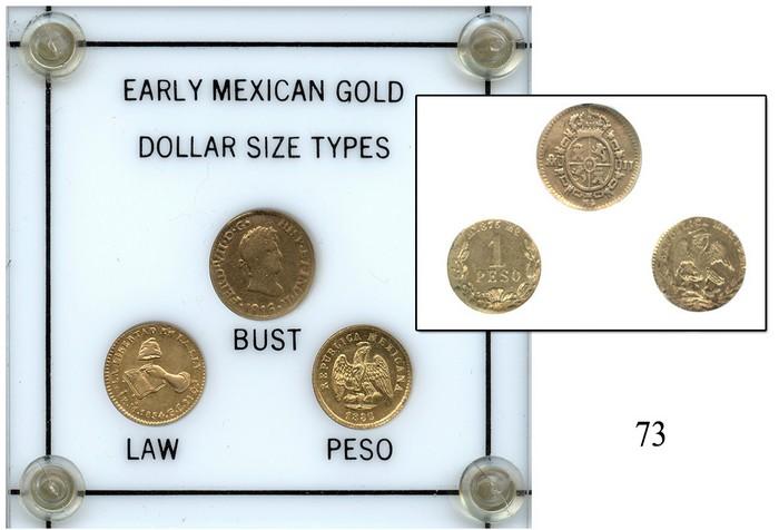 Presentation set of "EARLY MEXICAN GOLD DOLLAR SIZE TYPES" in hard-plastic case: ½ escudo 1816JJ ("BUST"), ½ escudo 1854GC ("LAW") and 1 peso 1882M ("PESO"). 3" x 3". The 1816 is About Fine, the 1854 is VF+, and the 1882 is Mint State, a cute little set that shows how the designs of the Mexican coins evolved throughout the 1800s while still retaining the same size and weight.