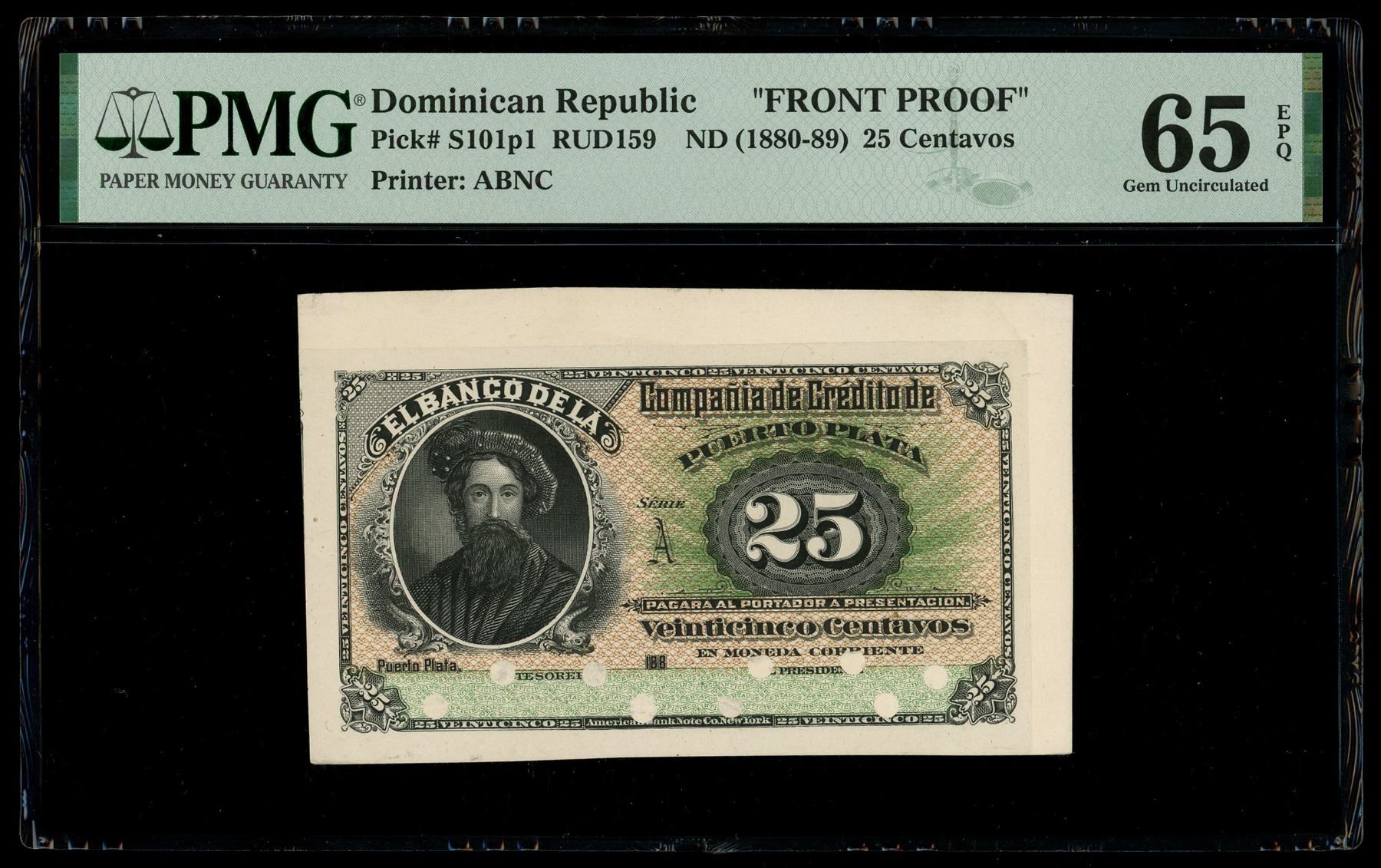 Puerto Plata, Dominican Republic, Banco de la Compania de Credito de Puerto Plata, 25 centavos front proof, no date (1880-89), series A, PMG Gem UNC 65 EPQ, ex-Rudman. SCWPM-S101p1; Rudman-159. Nicely designed ABNCo. front proof for this private bank in Puerto Plata, printer's annotation 1886 in pencil on back, second finest known of just four in the PMG census. 9 POCs. Pedigreed to the Isaac Rudman Collection. Please use this link to verify the certification number