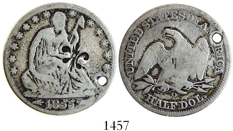 Puerto Rico, 1/2 dollar, lis countermark (1884) on USA (New Orleans mint) seated Liberty 1/2 dollar 1855-O. KM-10. 11.83 grams. Full countermark on a VG host with hole near edge, toned around details and inside countermark (good contrast).