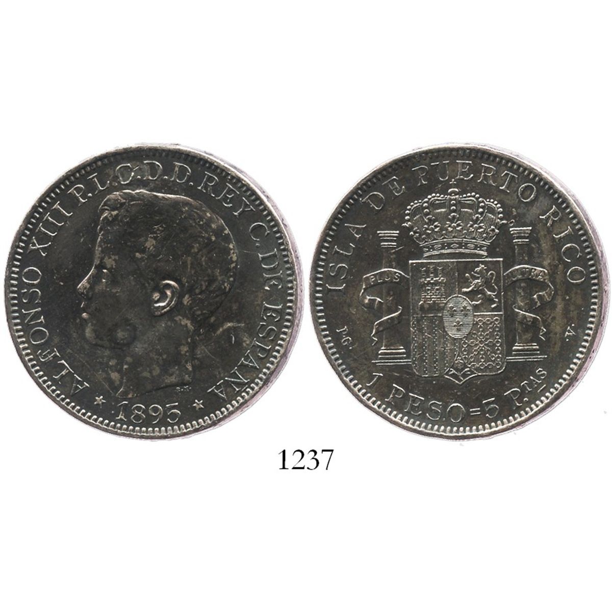 Puerto Rico, 1 peso (5 pesetas), 1895-PGV. KM-24. 24.8 grams. XF/AU, once cleaned but now darkly toned to disguise minor marks.