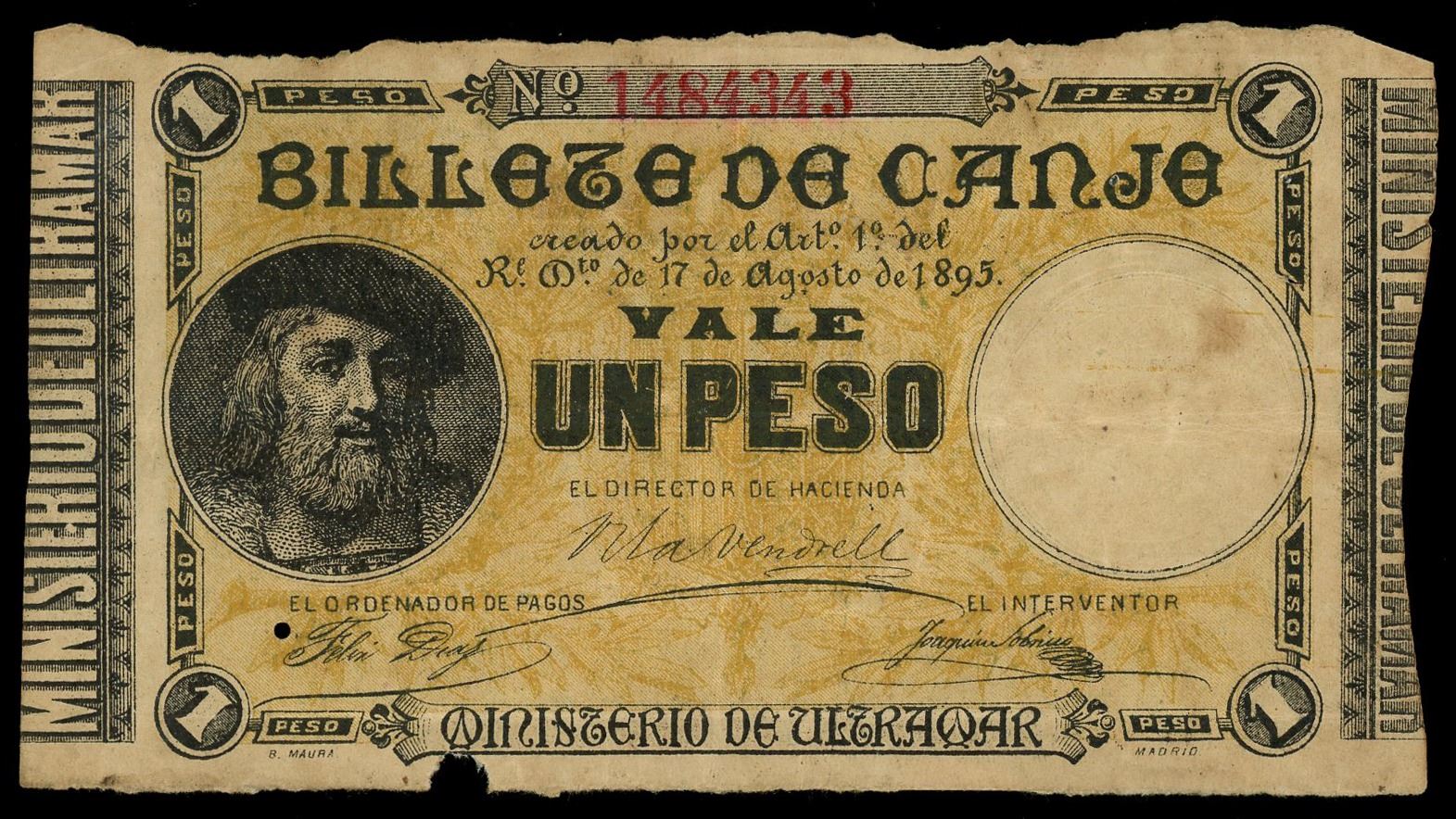 Puerto Rico, Ministerio de Ultramar, 1 peso, 17-8-1895, with partial counterfoil.