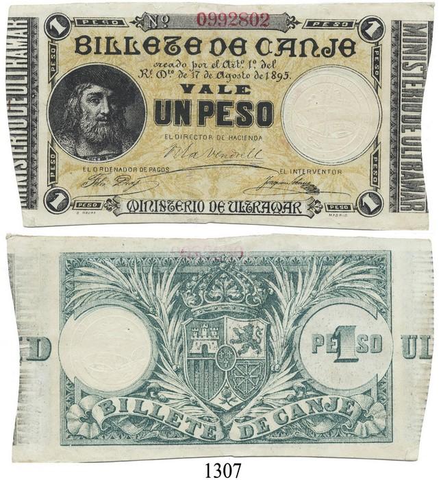 Puerto Rico (Spanish Department of Overseas Affairs), 1 peso compulsory "coin exchange" note, 1895. Pick-7c. About 5" x 2-5/8". Printed in Madrid with a portrait of an unidentified bearded man in black with yellow background and red serial number (0992802) on front, the back showing the Spanish coat of arms in green, dated August 17, 1895, both edges wavy-cut (where the receipt-like counterfoil was partially removed and the next bill to right was cut away), XF, encapsulated by PMG as "Extremely Fine 40". Notes such as these were issued by the Spanish government in exchange for Mexican pesos, which were being imported to the island at a higher value than their face value in Mexico.