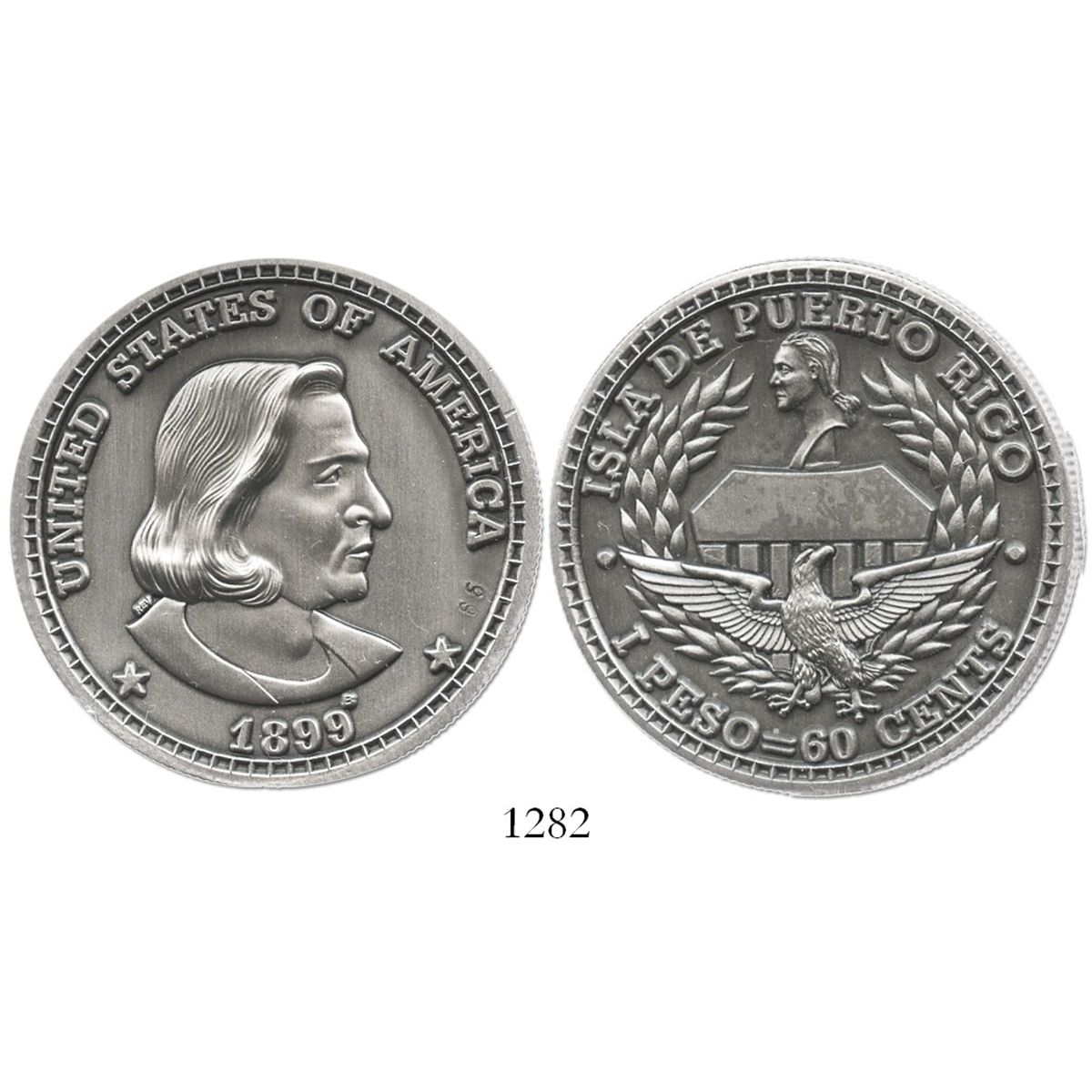 Puerto Rico, brass with antique silver finish "1899 peso/60 cents" Columbus commemorative, struck in 2009, limited edition #65/100. 45.0 grams. Modern medal made privately in Puerto Rico in a very limited quantity using a design created by the famous Philadelphia engraver and mint director Charles Barber in 1899 (but never minted), with bust of Columbus above date and UNITED STATES OF AMERICA on obverse and ISLA DE PUERTO RICO above and I PESO = 60 CENTS below montage of George Washington and Federal shield and eagle on reverse, Uncirculated.