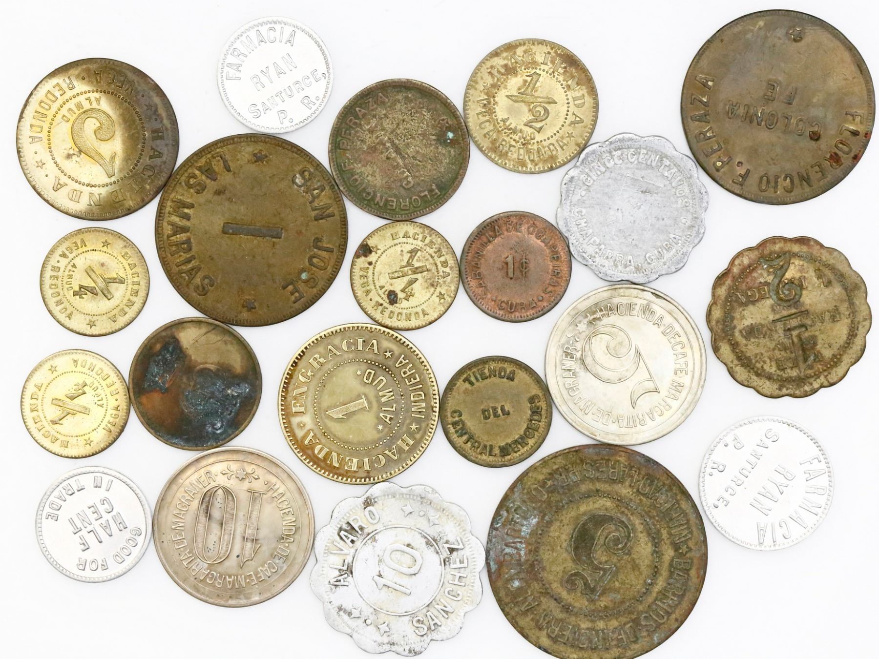 Puerto Rico, lot of 21 Puerto Rico hacienda tokens in various metals (1900s). 86.69 grams total. Varied group of tokens, a few with surface problems but otherwise fully readable and ready for study.