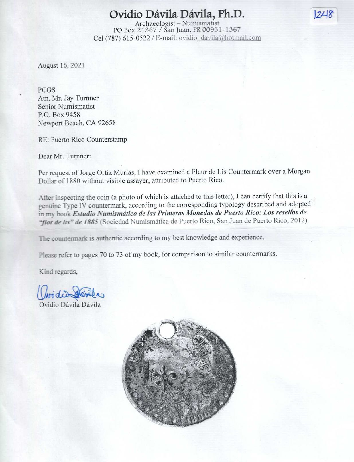Puerto Rico (under Spain), dollar, fleur-de-lis countermark (1885) on a USA (mint not visible), $1 Morgan, 1880, PCGS Good detail / holed, very rare. Cal-unl; KM-unl. The fleur-de-lis countermark of Puerto Rico was that island's only official countermark and was created after a decree on November 27, 1884, by the Governor, General Luis Daban, preventing the importation of more holed coins to Puerto Rico, the countermark being the official device to prove certain coins were on the island before the decree, which naturally prompted fake countermarks to be made as well. This example shows a full, genuine countermark (Davila's Type IV), the coin well toned and heavily worn but with bold date, with an enlarged hole at top from wearing on a key chain (unfortunately obliterating the mintmark, if there was one), very rare to be found in dollar size and the first fully authenticated example we have seen or heard of on a Morgan dollar (others are all seated Liberty or earlier). Amazingly this coin has resided in the same Puerto Rican family from its creation until now. Sra. Montserrate Hernandez Ramirez, born in 1883 in Maricao, Puerto Rico, received this coin as a gift from her father, Ruperto Hernandez, and left it to her son, Dr. Luis Amoros, when she died in 1958. Dr. Amoros died in 1965, and his widow, Hilda Alvarez, kept the coin and eventually passed it on to her son, Luis Alwin Amoros, Esq., from whom it was recently acquired and subsequently consigned to our auction. A very important piece for all US collectors, not just in Puerto Rico, and especially desirable for its fully documented pedigree and authentication. PCGS #42910152. With letter from expert numismatist Dr. Ovidio Davila Davila (author of Estudio Numismatico de las Primeras Monedas de Puerto Rico: Los Resellos de "flor de lis" de 1885 [2012]) certifying the authenticity of the coin and countermark.