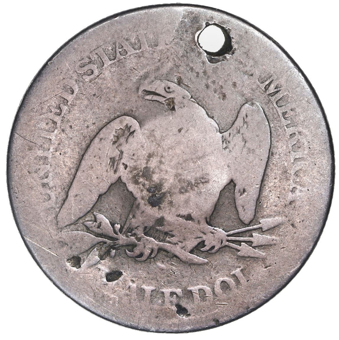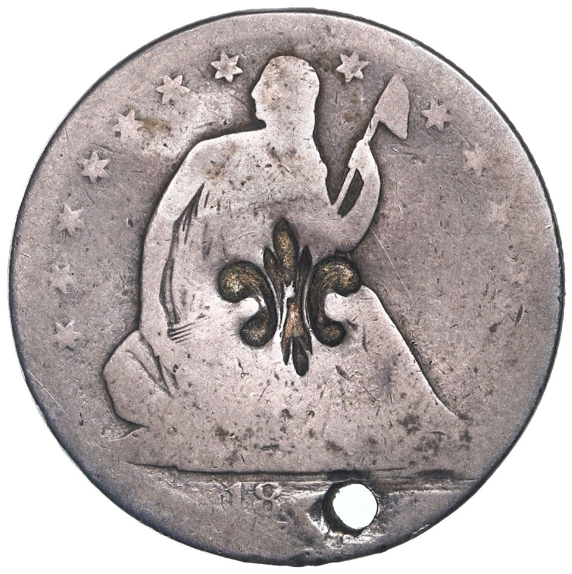 Puerto Rico (under Spain), half dollar, fleur-de-lis countermark (1884) on a USA (San Francisco mint) seated Liberty half dollar Type 2 with lower weight standard (1856-66), rare. KM-10. 11.54 grams. Choice bold countermark on well-detailed Liberty above clear 18 of date with requisite hole over rest of date, nicely toned Good with a few old marks on reverse.