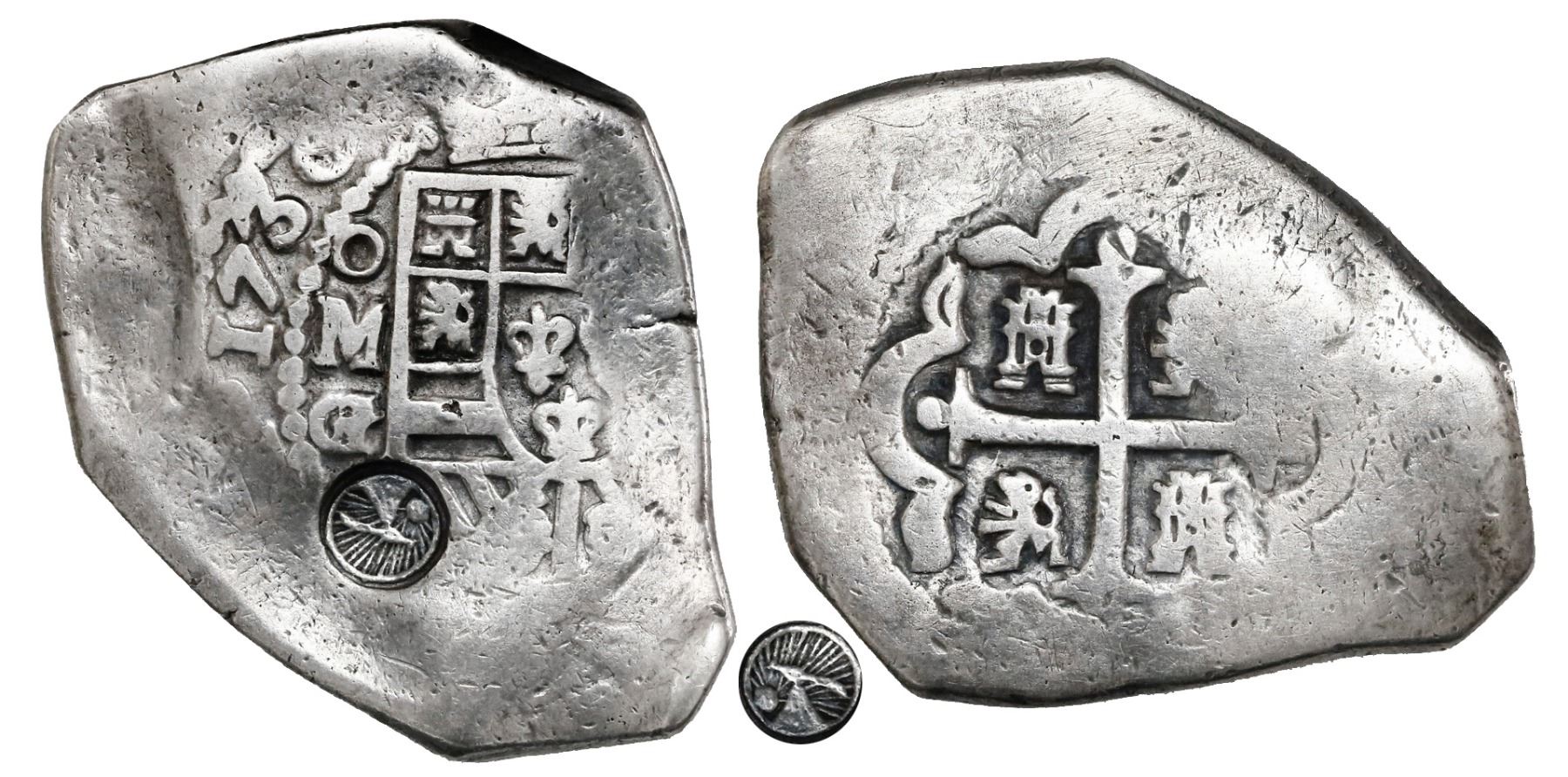 Quetzaltenango, Guatemala, 8 reales, Type I countermark (1838, rare) on shield side of a Mexico City, Mexico, cob 8 reales, 1730G, ex-Richard Stuart. KM-77.7. 26.35 grams. Bold full XF countermark below full oMG on VF host, with full date and nice cross but typically flat peripheries, all lightly toned. Pedigreed to the Richard Stuart collection.