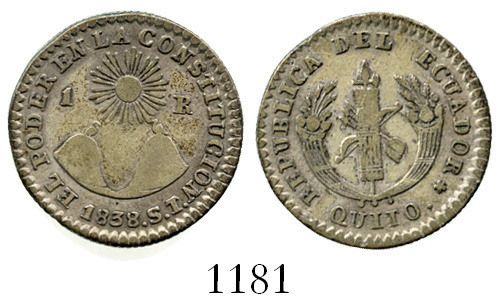 Quito, Ecuador, 1 real, 1838ST. KM-17. 3.2 grams. Attractive VF with hint of luster, lightly toned a