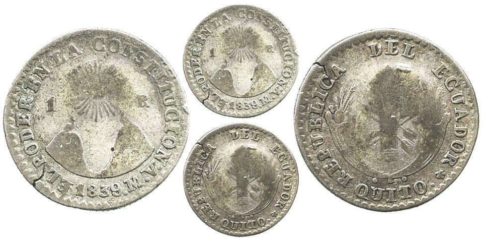 Quito, Ecuador, 1 real, 1839MV. KM-17. 2.9 grams. Old-toned Fine with very weak centers but traces of original luster, small split in edge.
