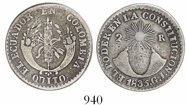 Quito, Ecuador, 2 reales, 1835GJ. KM-14. 6.29 grams. Nicely toned Fine+, no problems.