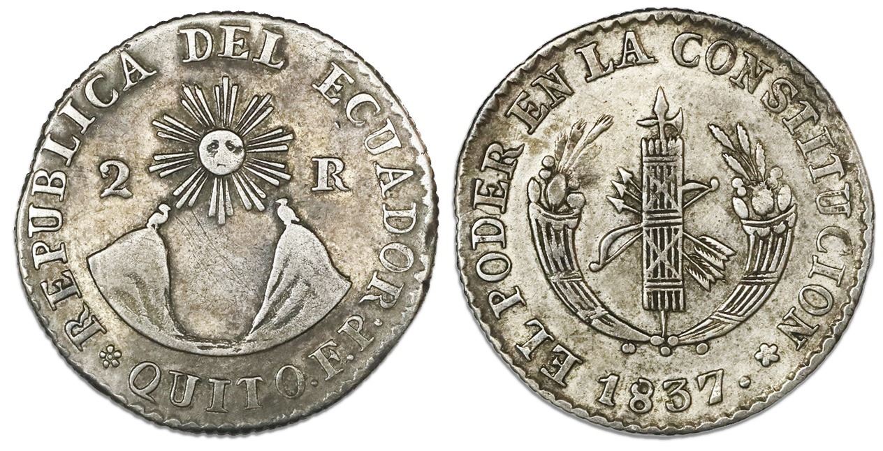 Quito, Ecuador, 2 reales, 1837FP, transposed legends, NGC VF 25. KM-21. Richly toned, with some weak rims (as made) and old central scratches, interesting type with Ecuadorian arms (sun over mountains) on one side and Gran Colombian arms (cornucopiae and fasces) on the other. NGC #4770526-027.