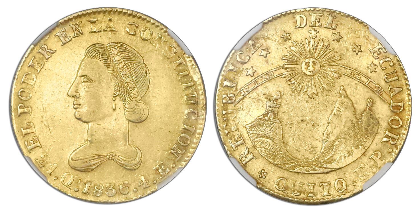 Quito, Ecuador, 4 escudos, 1836FP, NGC AU details / rim repair / cleaned. KM-19; Fr-4. Attractive butter-yellow color, typically rustic but all details clear, lots of minor marks and scuffs but also with fresh metal near part of rim where a mount affected the surfaces, scarce and popular type. NGC #4467951-009.