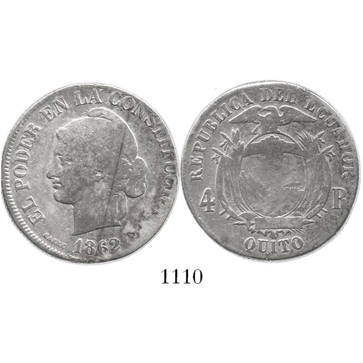 Quito, Ecuador, 4 reales, 1862. KM-41. 12.6 grams. Fine+ with a few old marks and light rainbow toning.