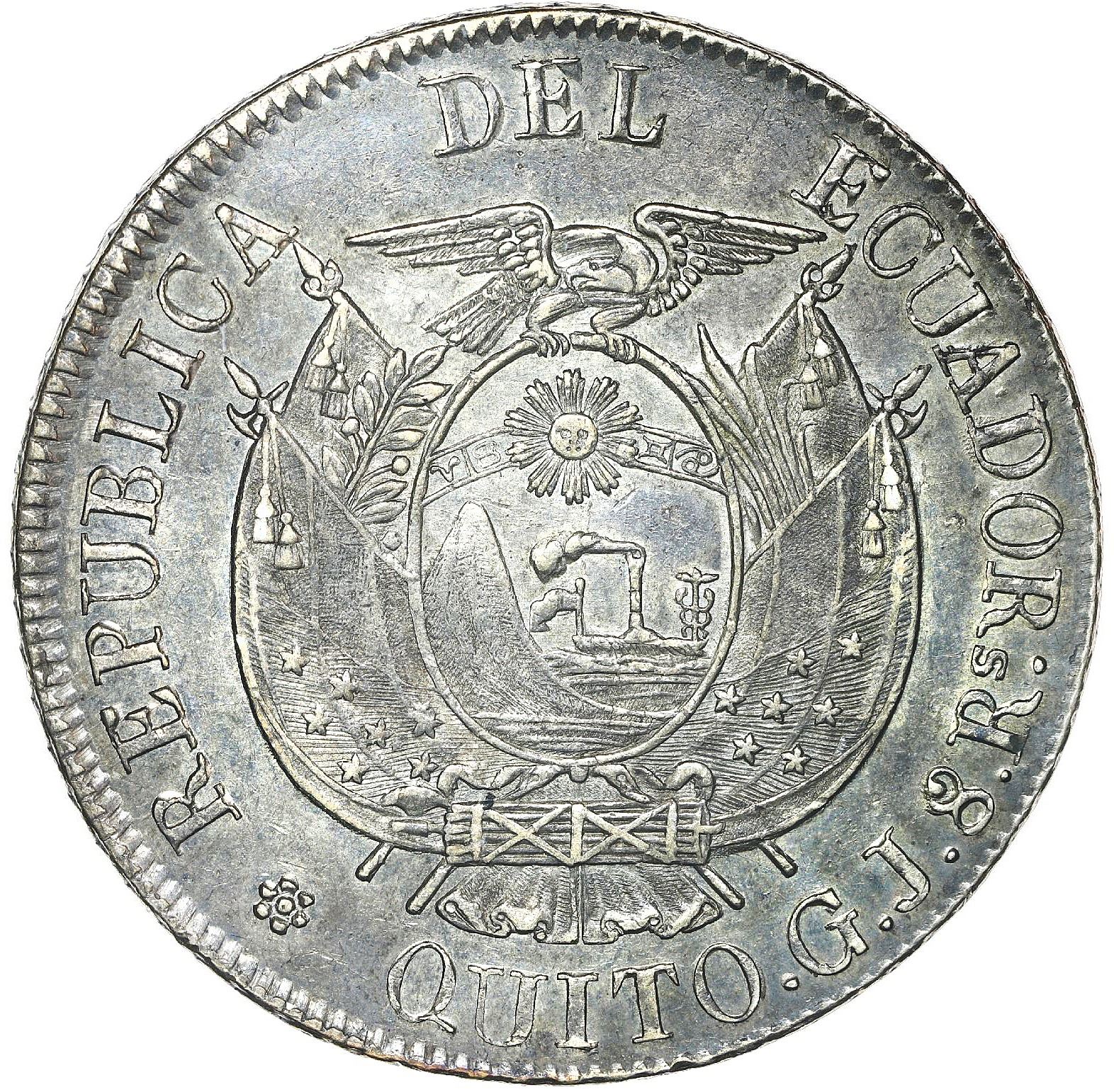 Quito, Ecuador, 8 reales, 1846 GJ, rare, NGC AU 55. Seppa-70; KM-32. Deeply toned over reflective fields with considerable original mint luster for the assigned grade, a rare and popular one-year type (only 1386 pieces struck) in beautifully artistic design (similar to the 5 francos of 1858) that has the distinction of being the only Ecuadorian 8 reales (old Spanish standard). NGC #5969618-001.