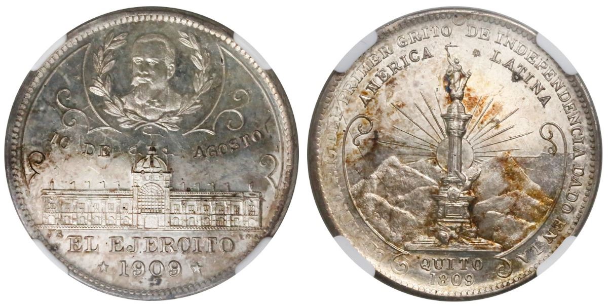 Quito, Ecuador, silver medal, 1909, Independence Centenary, encapsulated NGC MS 64, finest and only known specimen in NGC census. 30mm. Monument before mountains / Bust in two laurel branches above the palace of government. Struck in commemoration of the centenary of the first efforts toward winning independence. Lustrous example with "CENTENARIO" struck through grease, light toning with some darker streaks, NGC certification number 2806799013.