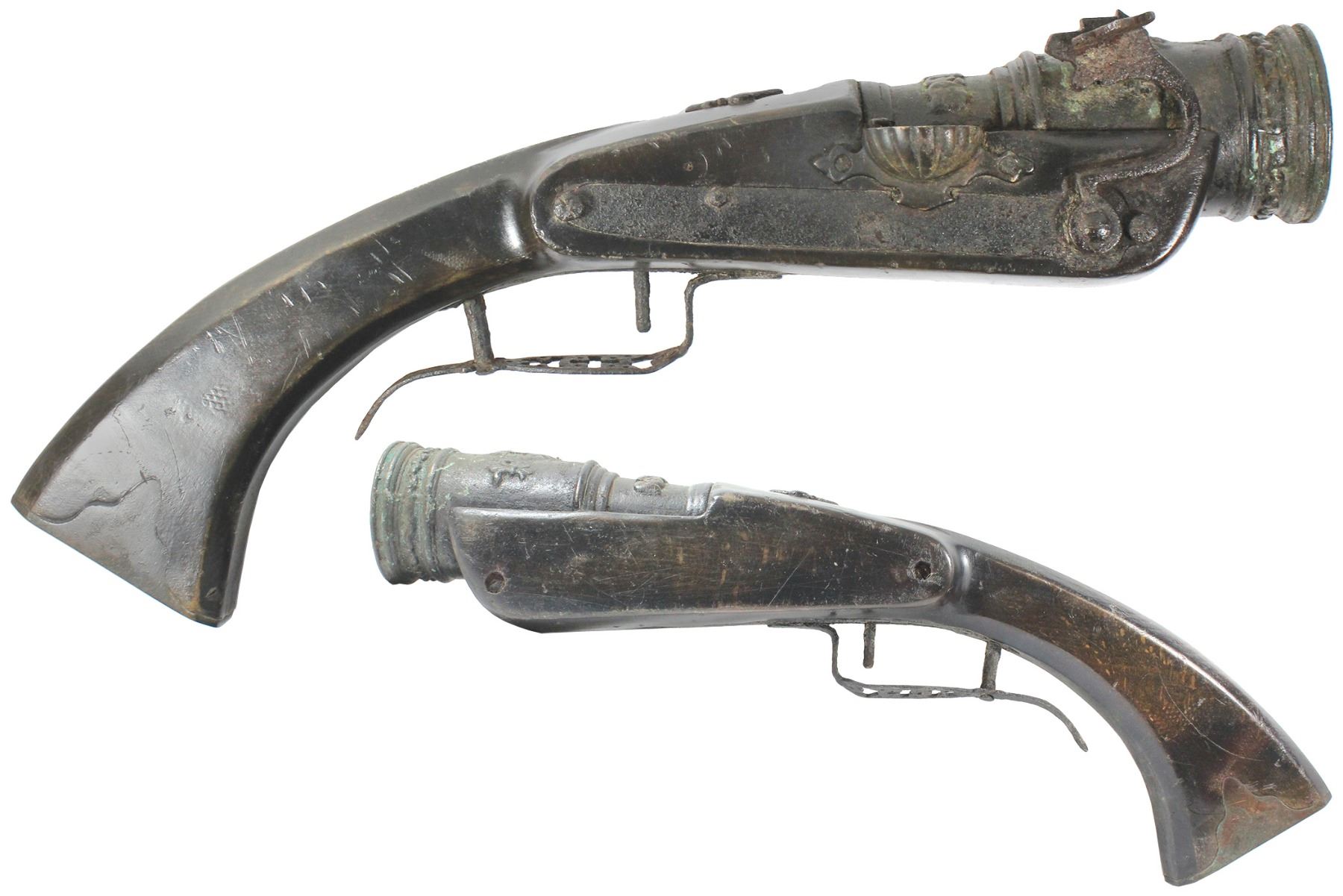 Rare European brass-barreled matchlock hand mortar, 1600s-1700s. 4802 grams, 22-1/2" long, 2-1/2" bore at mouth. Purchased in Spain in 1985, a very heavy, unusual handheld artillery of possible southern European origin which could fire hollow grenade shells or pyrotechnical incendiary projectiles. Made of ornate cast brass barrel and beechwood stock marked with fleurs-de-lis, simple matchlock mechanism, ornate iron trigger guard, simple brass butt plate, metal rusted in place, powder pan intact but iron cover rusted away, the first of its kind we've ever offered, with low number of surviving specimens possibly due to its questionable safety in battle. With photo-certificate.