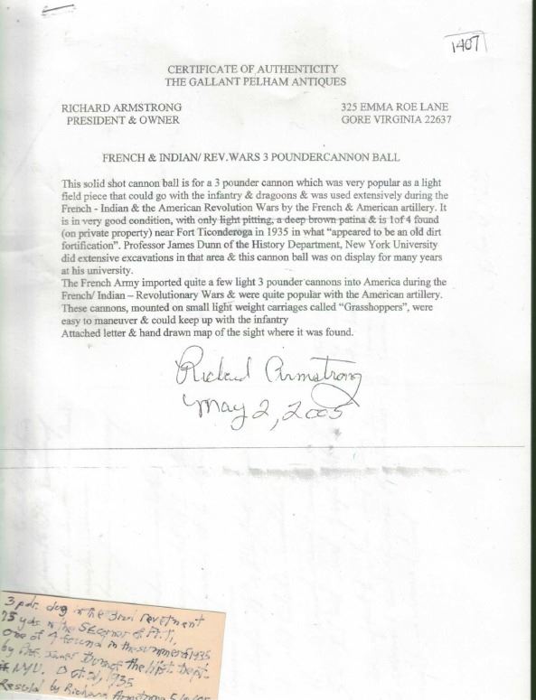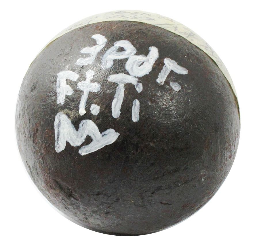 Revolutionary War-period iron cannonball "three pounder" from Ft. Ticonderoga, New York. 1647 grams, 2-3/4" in diameter. Heavy and solid sphere of iron with rather smooth surfaces and minor pitting and according to documentation, one of four found near Fort Ticonderoga in an old dirt fortification on private property by Dr. James Dunn, professor in the history department at New York University, "3 pdr. Ft. Ti NY" painted on one side. Found in 1935, with accompanying documentation.