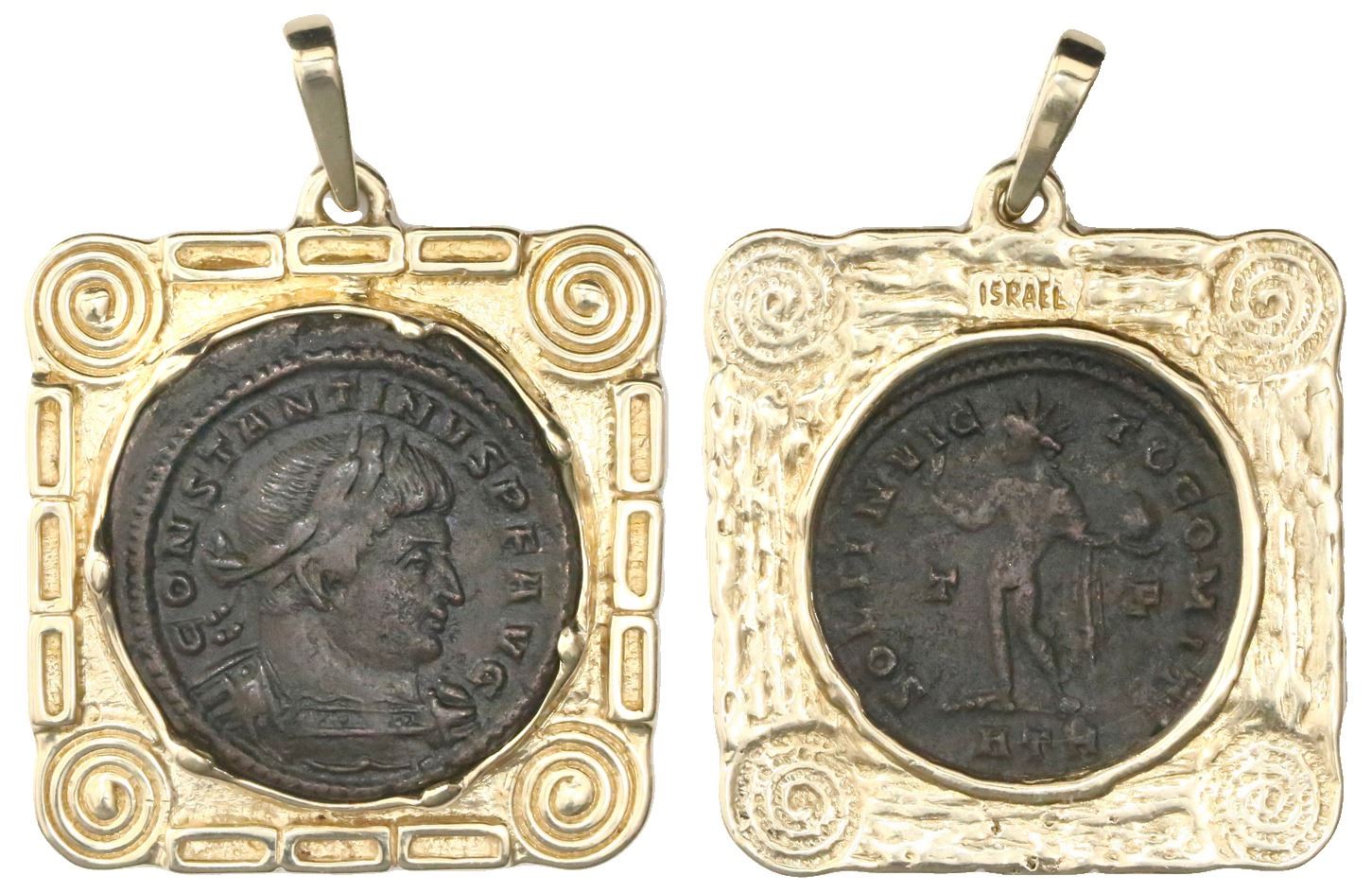 Roman Empire, AE follis, Constantine I, 313-315 AD, mounted Sol-side out in square 14K gold bezel with 14K gold bail. 9.69 grams total. CONSTANTINVS P F AVG, laureate, cuirassed bust right / SOLI INVIC TO COMITI, Sol with chlamys spread, radiate crown, standing right, head left, holding globe and raising right hand. Dark AVF with slight porosity, aligned axis.